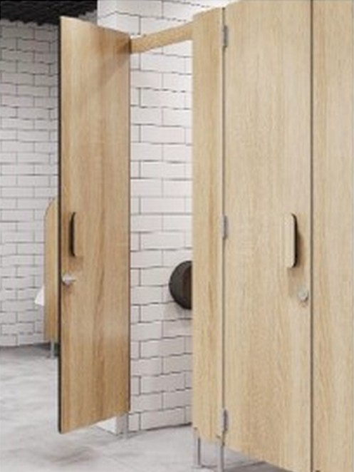 Сантехнические перегородки из HPL пластика 12мм. Высокопрочный и влагостойкий материал с антибактериальным покрытием. рофили — анодированный алюминий. Дверные полотна — травмобезопасное скругление углов R=30 мм. ЧПУ раскрой. Панели по периметру обработаны травмобезопасной фаской R2+R2 с шлифовкой среза. Ручка из HPL compact пластика 12 мм. Запорная фурнитура — завертка из нерж. стали с индикатором занятости.